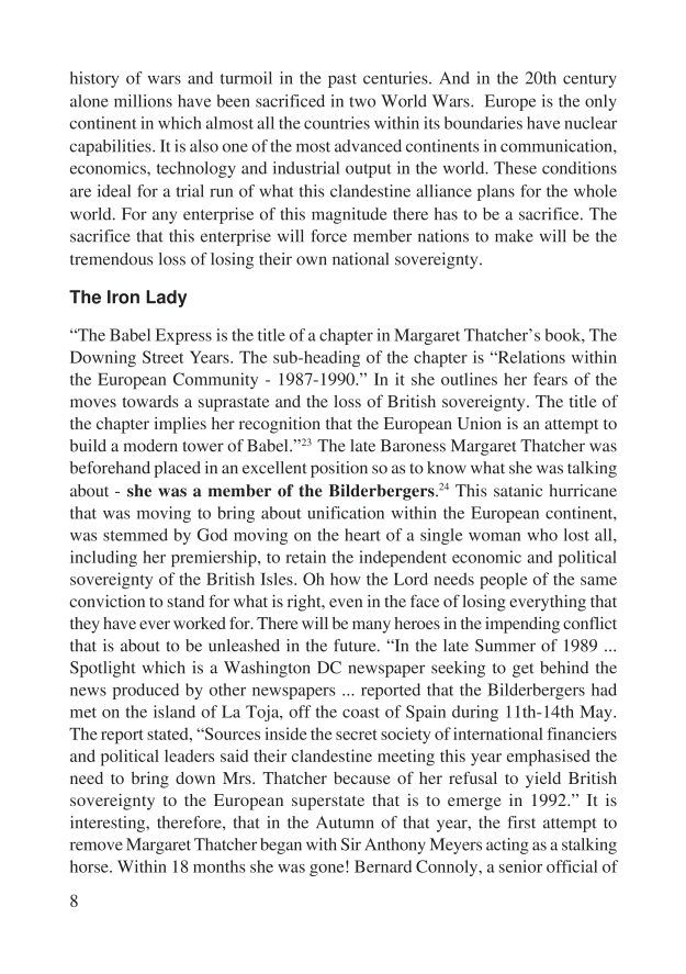“The Babel Express is the title of a chapter in Margaret Thatcher’s book, The Downing Street Years. The sub-heading of the chapter is “Relations within the European Community - 1987-1990.” In it she outlines her fears of the moves towards a suprastate and the loss of British sovereignty. The title of the chapter implies her recognition that the European Union is an attempt to build a modern tower of Babel.”22 The late Lady Margaret Thatcher was beforehand placed in an excellent position so as to know what she was talking about - she was a member of the Bilderbergers.23 This satanic hurricane that was moving to bring about unification within the European continent, was stemmed by God moving on the heart of a single woman who lost all, including her premiership, to retain the independent economic and political sovereignty of the British Isles. Oh how the Lord needs people of the same fidelity to stand for what is right, even in the face of losing everything that they have ever worked for. There will be many heroes in the impending conflict that is about to be unleashed in the future. “In the late Summer of 1989 ... Spotlight which is a Washington DC newspaper seeking to get behind the news produced by other newspapers ... reported that the Bilderbergers had met on the island of La Toja, off the coast of Spain during 11th-14th May. The report stated, “Sources inside the secret society of international financiers and political leaders said their clandestine meeting this year emphasised the need to bring down Mrs. Thatcher because of her refusal to yield British sovereignty to the European superstate that is to emerge in 1992.” It is interesting, therefore, that in the Autumn of that year, the first attempt to remove Margaret Thatcher began with Sir Anthony Meyers acting as a stalking horse. Within 18 months she was gone! Bernard Connoly, a senior official of